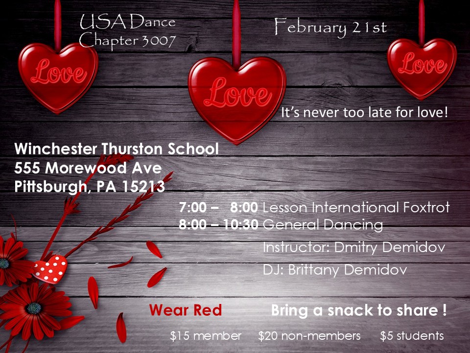 February 21 Monthly Dance at Winchester Thurston School, 555 Morewood Street at the corner of Ellsworth Ave, Shadyside. Building & parking lot entrance off Ellsworth, adjacent to the sports field. Dmitry Demidov teaching International Foxtrot and Brittany Demidov, DJ.